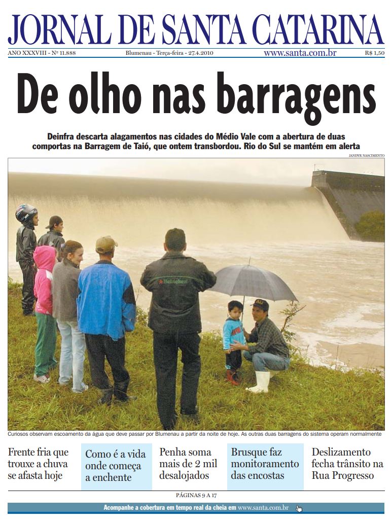 Quando a superfície do Rio Itajaí D’Oeste alcançou o limite de 21 metros da Barragem de Taió, às 13h10min de ontem, o excedente já tinha destino certo: descer o curso do rio e desembocar em Blumenau entre 24 e 28 horas depois. Como o nível da água subiu 10 centímetros por hora, às 19h o gerente de Obras Hidráulicas e Barragens do Deinfra, Guilherme Rodolfo Bresciani, decidiu abrir duas das sete comportas para escoar o volume de água, que já estava em 21,56 metros, e não comprometer a estrutura da represa. Às 2h de hoje, outras duas comportas seriam abertas, seguida de mais duas às 4h. A última comporta seria liberada às 8h.